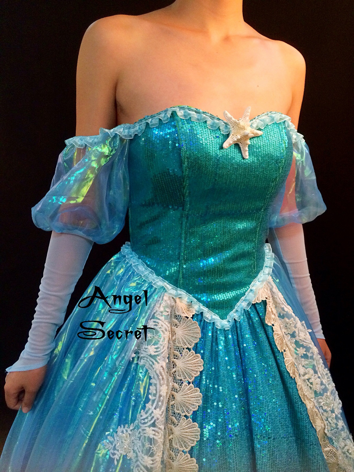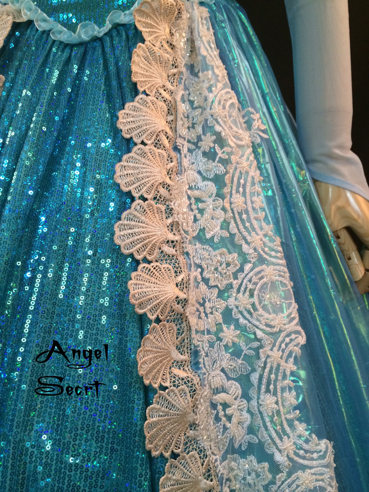P157 Ariel sequins material teal shell lace trim